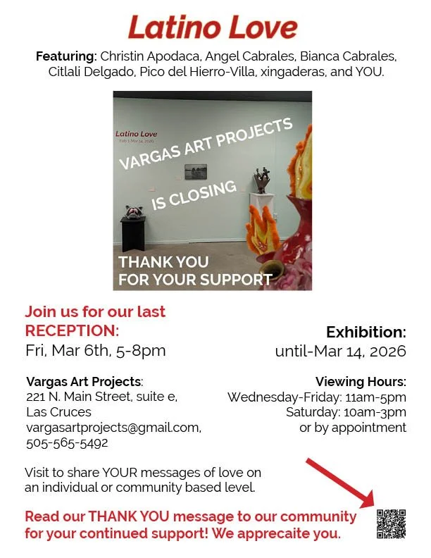Latino Love will be our last exhibition. I hope that you can make it to our final reception Fri, Mar 6th, 5-8pm or while the exhibition is on view, through Mar 14, 2026. I look forward to wrapping up this project in celebration with you.
